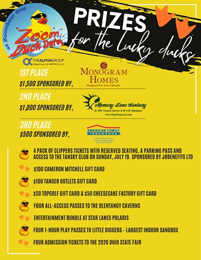 You don’t have to be present to win, but why miss the fun? A $30 Adult Waddles Pass, and a $20 Kids' Waddles Pass are a $60 value! They include: one duck entry, admission to the Columbus Zoo and Zoombezi Bay, free parking, kids' games, prizes, crafts, and a DJ. Plus, the wave-pool and select water slides will be open 90-minutes before the park opens to the public thanks to The Fraternal Order of Eagles 376.