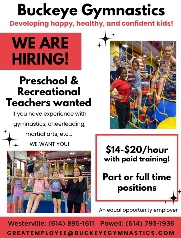 Buckeye Gymnastics is hiring part-time and full-time in Powell & Westerville, $14 to $20/hr. Create your own schedule. Get paid while you train.