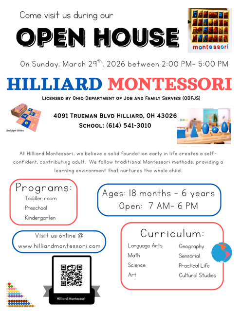 Hilliard Montessori believes a solid foundation early in life creates a self-confident, contributing adult and follows traditional Montessori methods, providing a learning environment that nurtures the whole child.