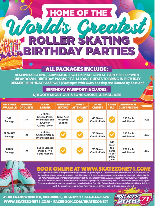 Skate Zone 71 provides roller skating and family fun for all ages! Skate Zone 71 features a Roller Cafe full of family favorites. Skate Zone 71 also offers state-of-the-art sound systems, live DJs, a fully stocked cafe and a huge arcade with awesome prizes.Come join Skate Zone 71 for kids’ birthday parties, fundraisers for your schools and groups, and exercise and family fun for all! Skate Zone 71 is THE #1 place in Columbus for not only birthday parties but parties of all shapes and sizes! The mission is to make dreams come true by providing the perfect environment for people of all ages, organizations, schools, clubs and groups to have incredible parties for all types of events!